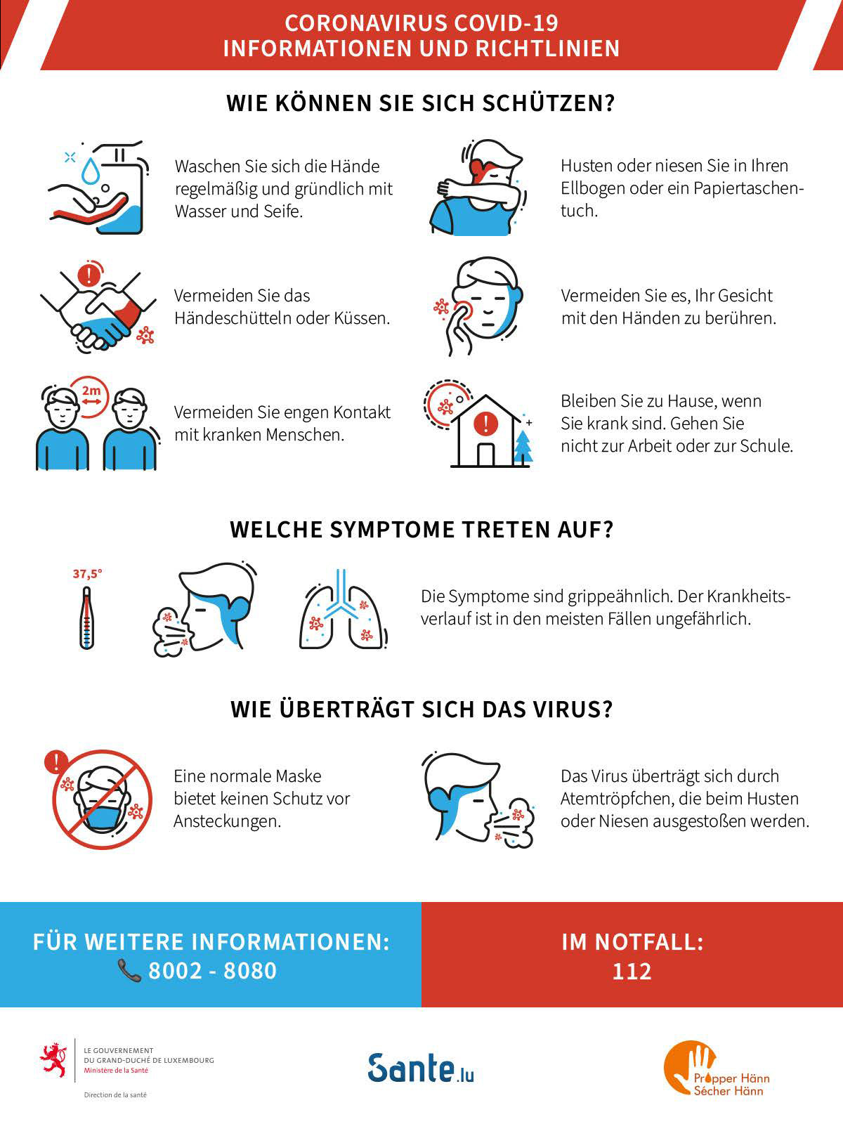- Das wichtigste: waschen Sie sich die Hände regelmäßig und gründlich. Den besten Weg, sich die Hände zu waschen, finden Sie online unter www.sante.lu.