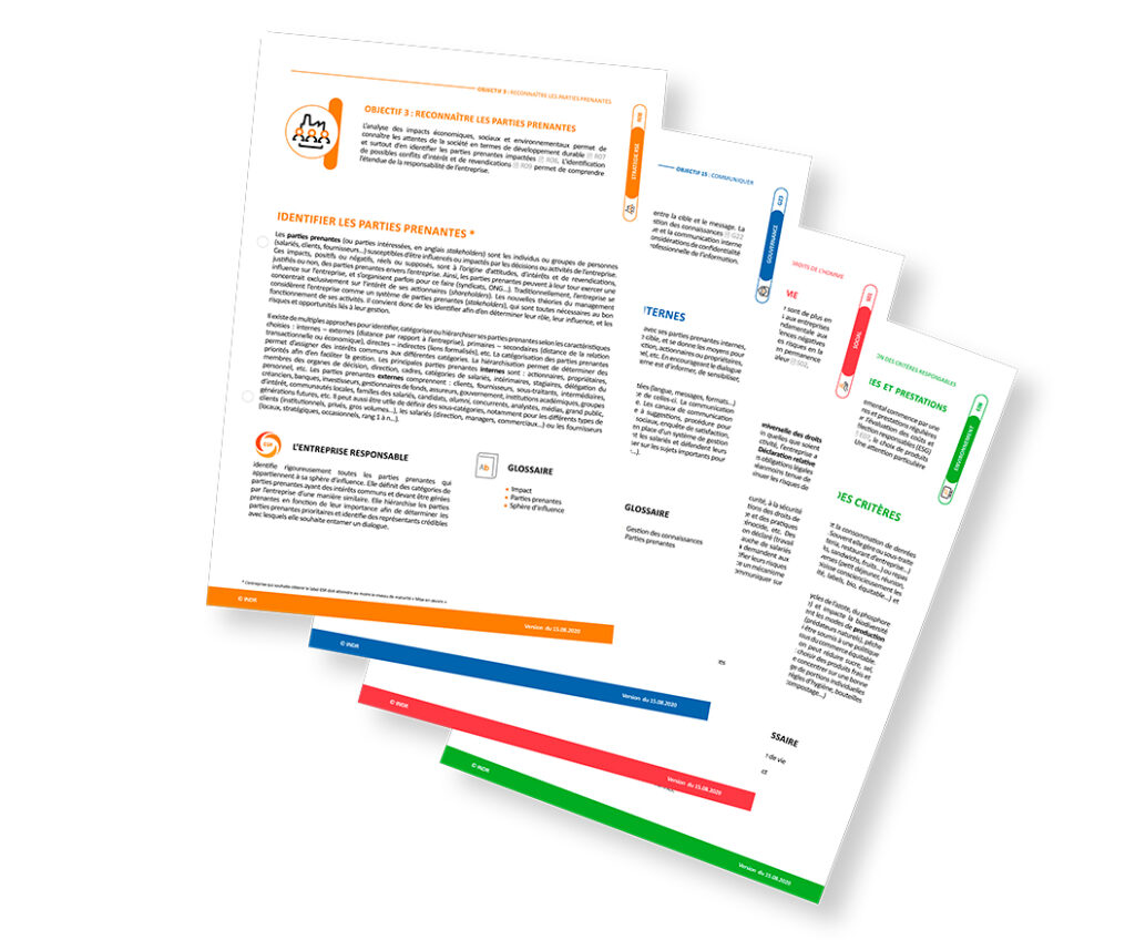 Der ESR-Leitfaden bildet die Grundlage für das vom INDR geförderte umfassende Programm zur Unterstützung von Unternehmen ESR – ENTREPRISE RESPONSABLE. In diesem Rahmen bereitet er das Unternehmen auf seine Online-Selbstbewertung vor und begleitet es bei Interesse auf dem Weg zum Label ESR – ENTREPRISE RESPONSABLE.
