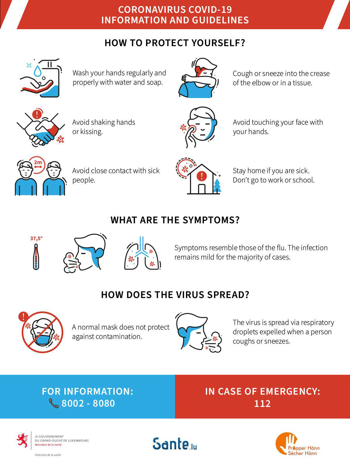 For all other questions related to COVID-19, please consult the websites of the Government www.covid19.lu, of the Ministry of Health www.gouvernement.lu/coronavirus, the European Center for Disease Prevention and Control (ECDC) www.ecdc.eu or the World Health Organization (WHO) www.who.int.