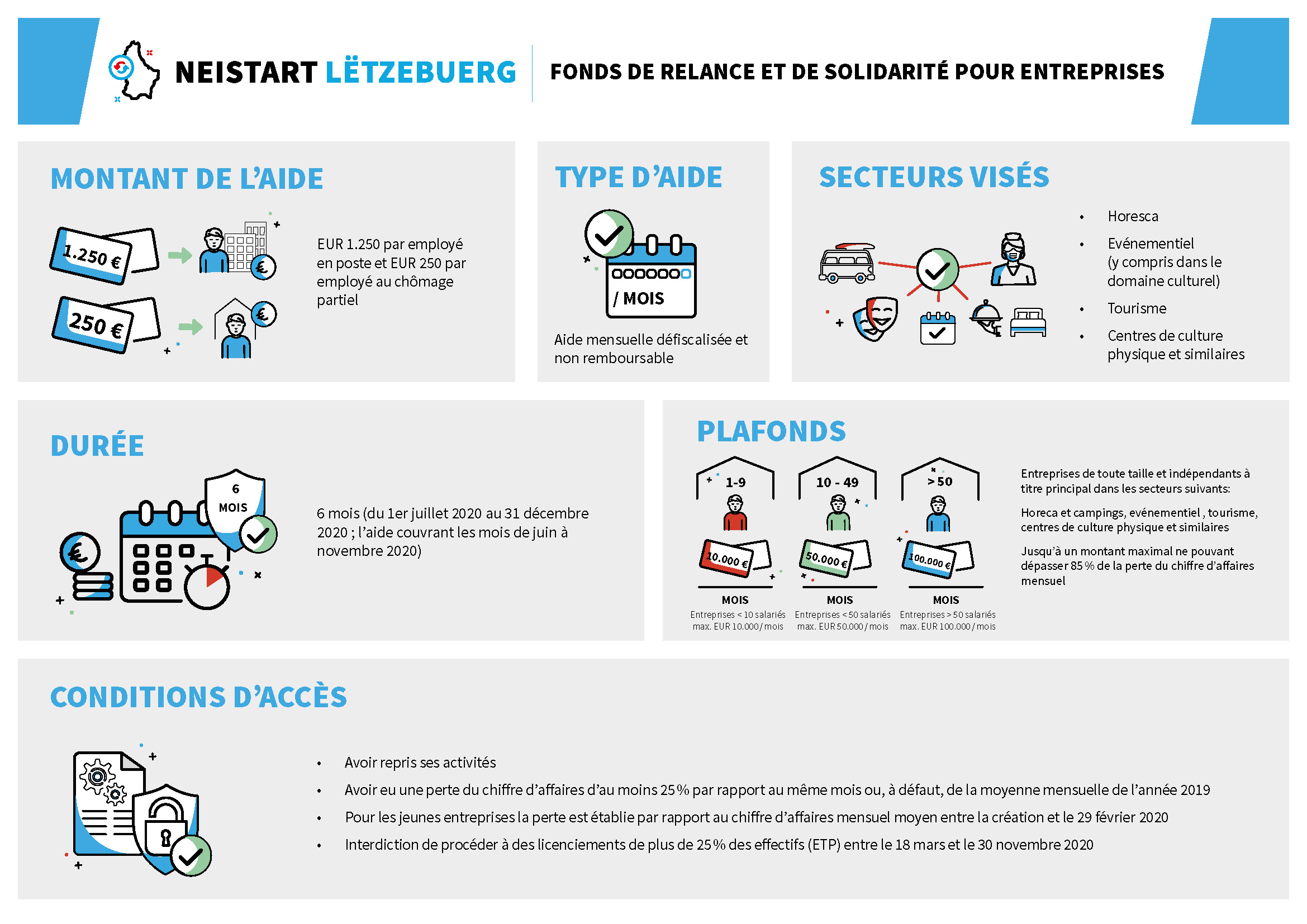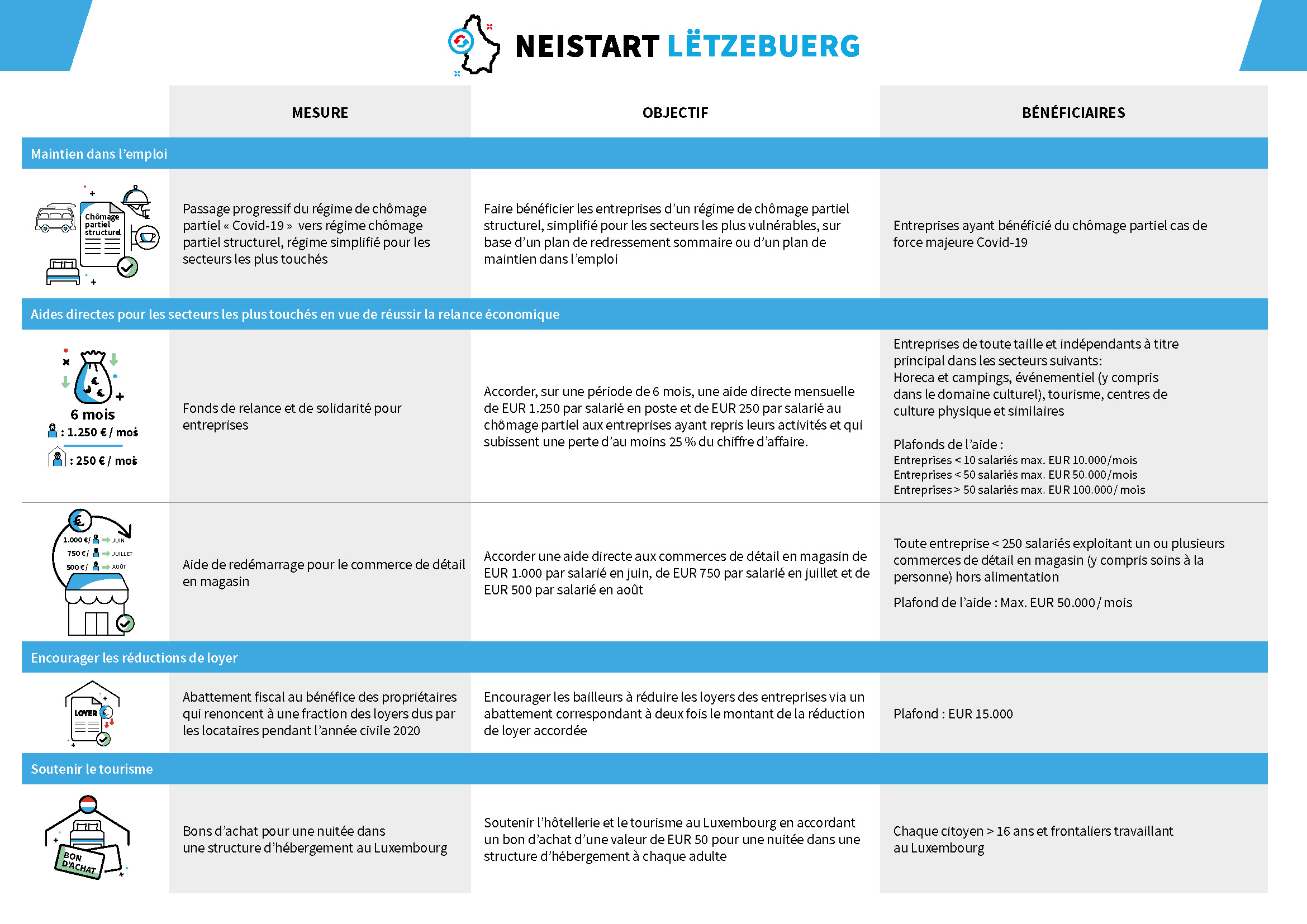 On 20 May 2020, Deputy Prime Minister Dan Kersch, Deputy Prime Minister François Bausch and Finance Minister Pierre Gramegna presented a support package aimed at paving the way for a new start for the Luxembourg economy in the wake of the COVID-19 health crisis. With this additional package of measures, the final cost of which is estimated at between 700 and 800 million euros, the government has so far made available direct expenses amounting to 3 billion, or 5% of GDP, to support the economy.