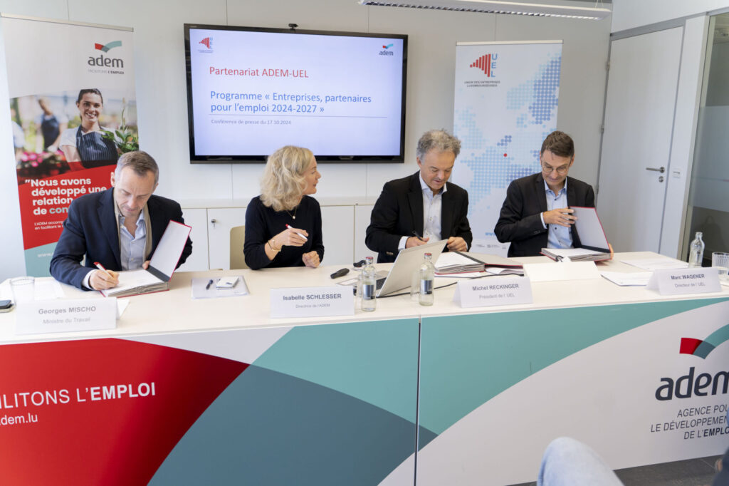 Luxembourg – 17.10.2024. En présence du ministre du Travail, Georges Mischo, l’Agence pour le développement de l’emploi (ADEM) et l’Union des Entreprises Luxembourgeoises (UEL) ont officialisé aujourd’hui le renouvellement de leur programme « Entreprises, partenaires pour l’emploi » pour la période 2024-2027. Ce partenariat, initié en 2015, vise à renforcer les efforts communs en faveur de l’employabilité et à soutenir le recrutement dans un marché de l’emploi en constante évolution.Bilan du partenariat 2021-2023 : des résultats prometteursLors de la conférence de presse, l’ADEM et l’UEL ont présenté le bilan positif des initiatives menées au cours de la période 2021-2023. Plusieurs actions phares ont été mises en avant :