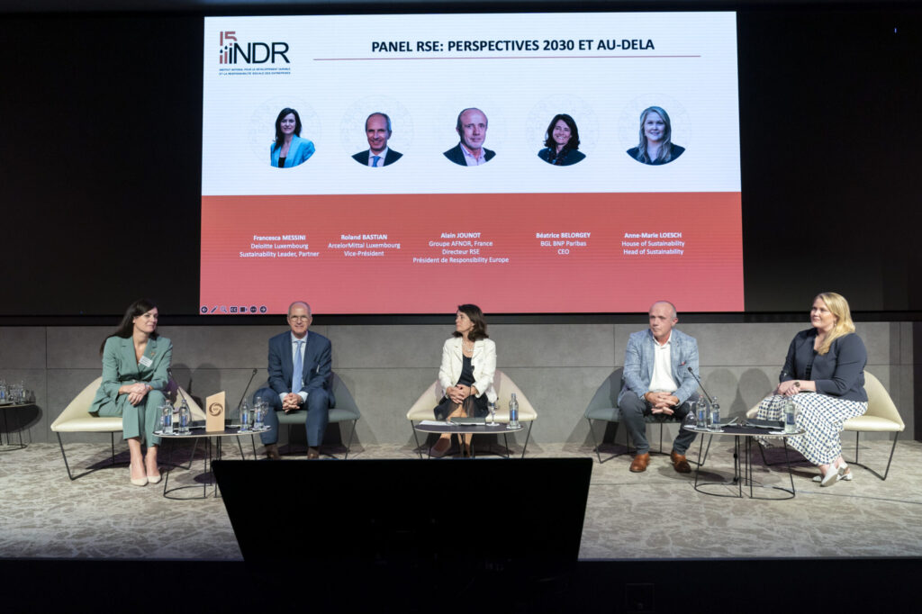 The evening continued with a panel discussion on “CSR perspectives to 2030 and beyond”, during which Anne-Marie Loesch, Head of Sustainability, House of Sustainability, Francesca Messini, Sustainability Leader Deloitte Luxembourg, Béatrice Belorgey, CEO BGL BNP Paribas Luxembourg, Alain Jounot, CSR Manager AFNOR Group, and Roland Bastian, Vice-President ArcelorMittal Luxembourg, contributed their vision and concrete insights from action plans implemented in their organizations.